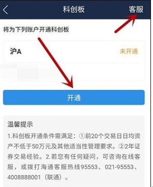 5、然后选择A股账户,点击下方的“开通”进入科创板的在线开通流程。不懂的还可以点击右上角的“客服”,咨询客服。