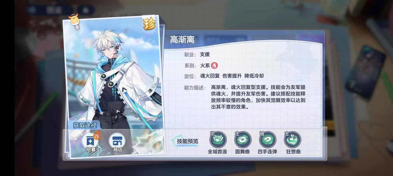 高渐离是一个优秀的魂火回复神使,在能为队伍提供魂火的同时,还能为队伍提供增伤,本次的阵容中,每个神使都需要释放觉醒来达成输出、免伤、增伤等目的,因此,高渐离能极大的为队伍提供魂火来源。