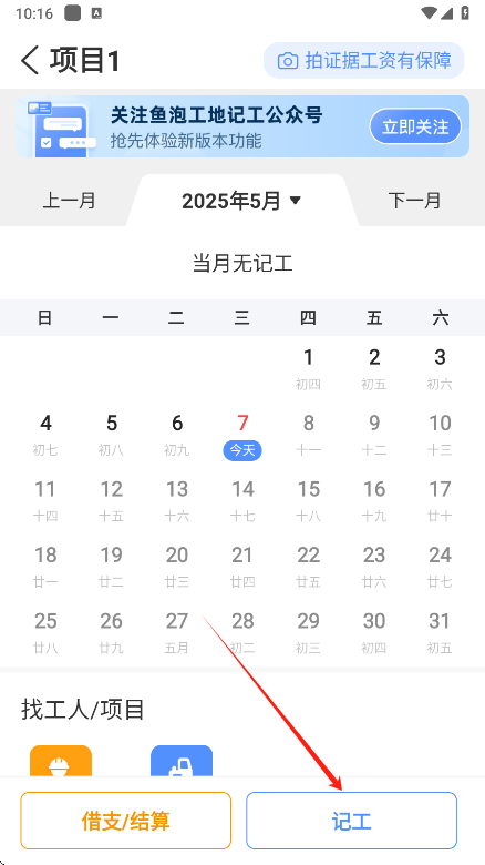 4、直接点击日期或者点击下方的记工,就能为当天记工