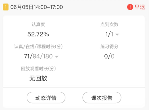 2、选择相应课程【课堂动态】,孩子的学习情况一目了然。还能查看孩子是否早退。