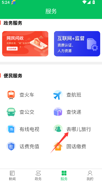 2、进入服务页面后,浏览众多服务图标并点击其中的“去哪旅行”选项,进入旅游服务板块。