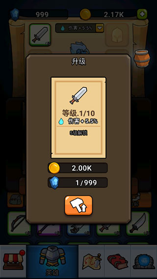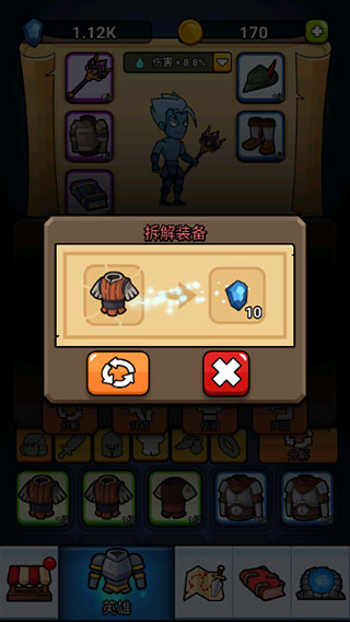 1、进入英雄城堡游戏后点击英雄即可查看自身的装备,每种品质不同的装备都有着不同的威力;