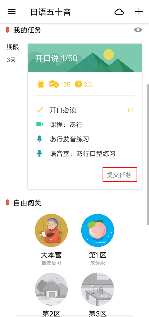 1、最最日语可以帮助用户随时随地轻松学习日语,但发现很多小伙伴在添加任务后不知道怎么取消任务,想知道的赶快来看看下面的教程吧!小编依次为大家演示添加与取消任务的方法,用户只需点击右上角的“+”号选项,即可添加任务。