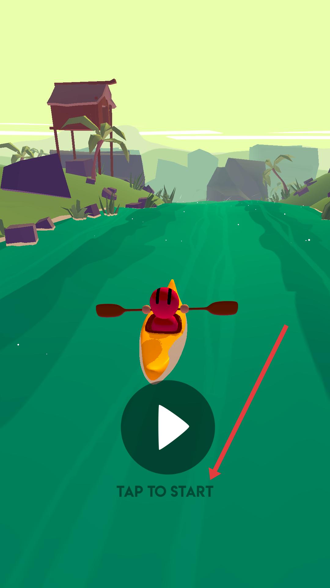 1、界面有点击开始游戏的提示,点击屏幕开始游戏,操控皮划艇在河道中前行,开启水上冒险。