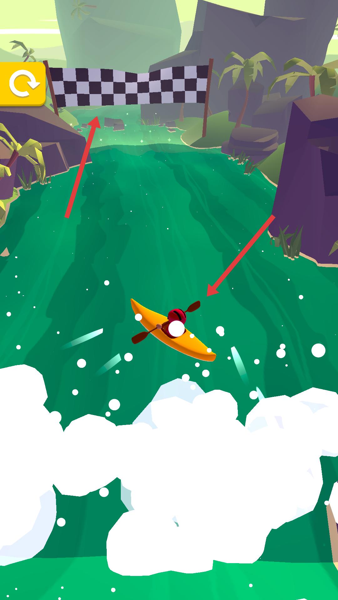 3、操控皮划艇向终点的黑白格子旗前进,在河道中注意水流和障碍,保持皮划艇稳定,快速冲向终点。