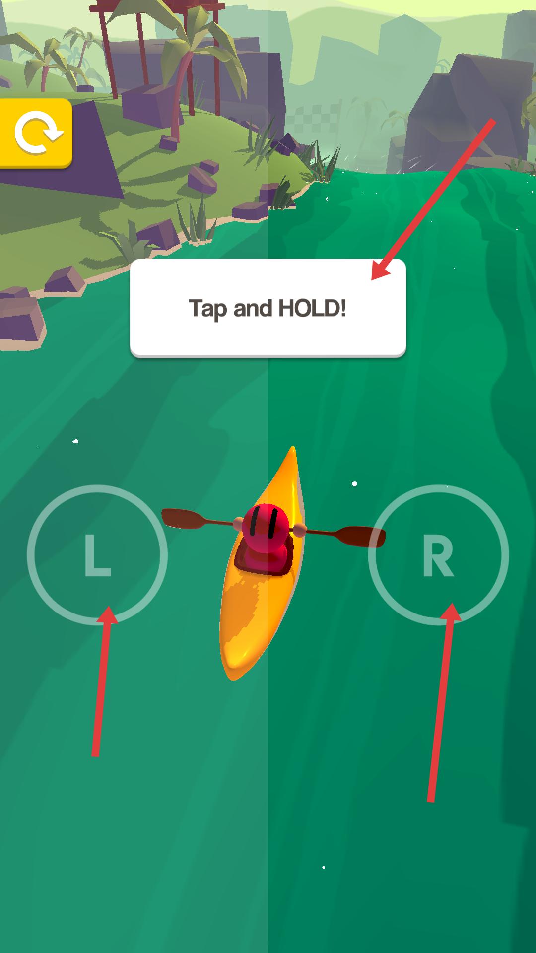 2、游戏提示点击控制,通过点击并按住左右两侧的按钮,控制皮划艇的行进方向,灵活操作避开障碍。