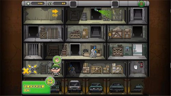1、下载并安装本站提供的神偷鲍勃4,打开进入游戏点击屏幕就可以进行移动,当到了在门口,会显示离开的图标,点击图标,就可以到达另外一个地方,如图所示