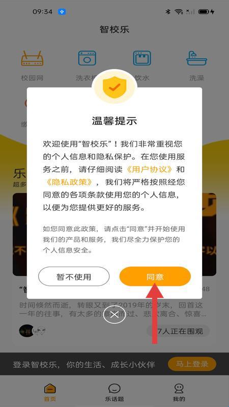1、打开智校乐最新版,阅读温馨提示后点击同意进入登录界面,选择验证码或密码登录方式,输入手机号等信息登录。