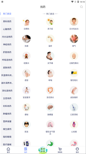 5、前往“找药”板块,按分类浏览更多药品。