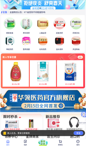 2、首页展示各类药品,或通过搜索框查找所需产品。