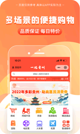 贵州省在“大扶贫、大数据、大生态”战略背景下全新打造的一站式消费平台;平台通过汇聚贵州省内外品牌商家,尤其是能够代表贵州的名特优产品,为省内外用户提供多形态(线上商城、团购、大宗交易、门票、出行、便民缴费、外卖、出行、健康)的电商消费场景,带来安全高效、体验良好、品优价美的消费体验。
