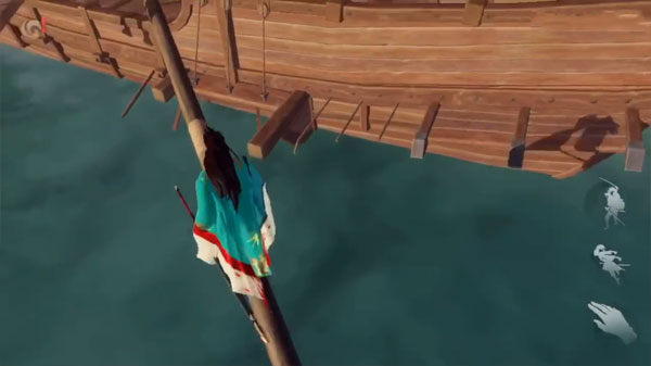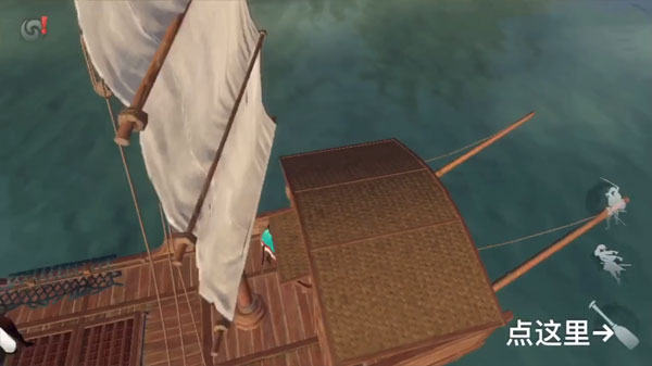 主角来到船尾,就可以看见图标变成一个船桨,点击就可以开启小船,左手前推小船前进,右手则可以控制小船的视野视角。