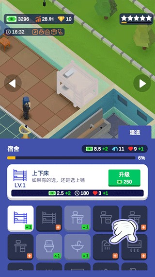 2、购买物品设置来改善寝室状况,建造物品可以提高收益,现在点击淋浴建造浴室