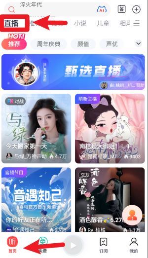 2、首页默认展示为“直播”界面,用户可以浏览正在直播的内容,点击封面即可进入直播间进行收听。