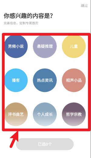 1、首次使用时会弹出兴趣选择页面,根据个人喜好勾选内容,有助于平台推荐更适合的音频资源。