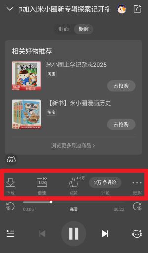 4、在播放界面可以调节倍速、下载音频、点赞、评论,并查看相关推荐商品,支持边听边购。