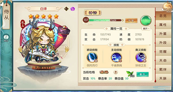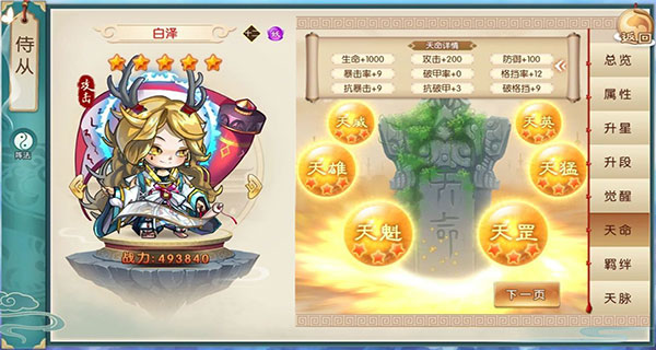 [升级]:升级是让英雄变强的基础途径,英雄达到一定的等级后可以喂食丹药,不同的丹药可以提升或降低相应的属性点数,以此来提高侍从的基础属性。