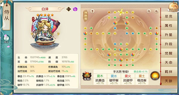 [天脉]:提升侍从属性的主要手段之一,通过消耗天晶碎片、天脉点数和金币来炼制道具,激活天脉穴位。