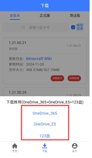 接着点击下方的“下载”,我们可以看到各种版本的游戏资源。