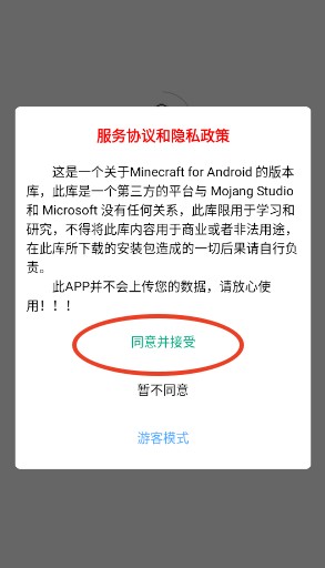 本站下载安装最新版的MC版本库app,点击同意并接受,打开软件。