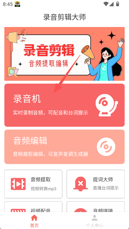1、点击“录音机”,进入录音配音页面。