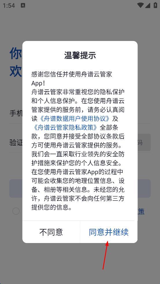 1、打开舟谱云管家APP,弹出温馨提示,仔细阅读后点击“同意并继续”,进入登录界面。
