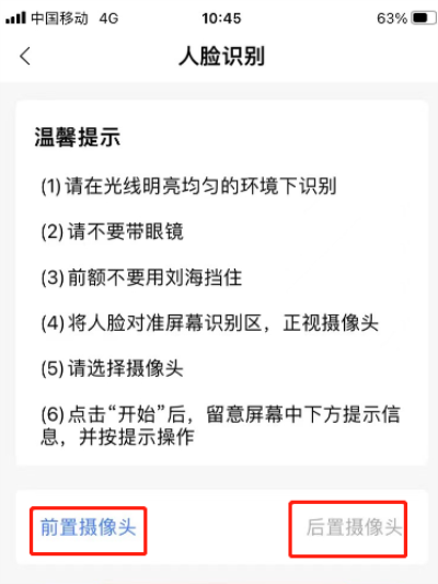 5.仔细阅读温馨提示,选择“前置摄像头”或“后置摄像头”。