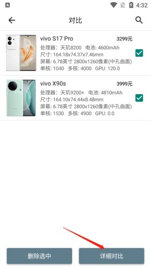 4、如果要进入对比,首先要选择两款手机加入对比,然后再点击进入对比,选中这两款手机,最后点击下方的详细对比。