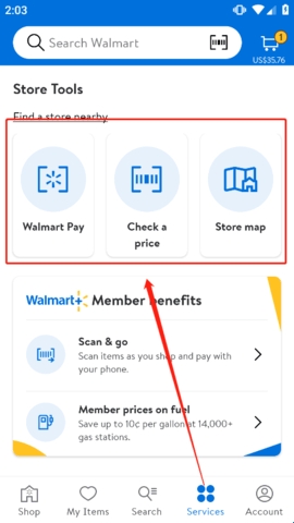 4、还能在“services”里面看到一些专属于沃尔玛的专属服务,扫码等。