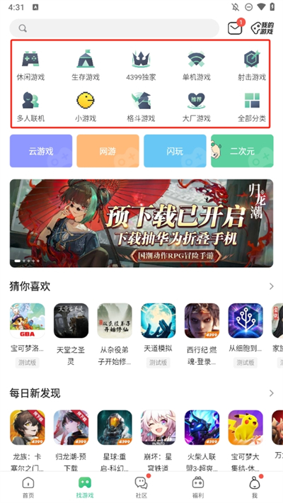 2、点击后进入游戏推荐界面,在这里可以看到许多的热门游戏,在上面还有许多的游戏分类可以筛选;