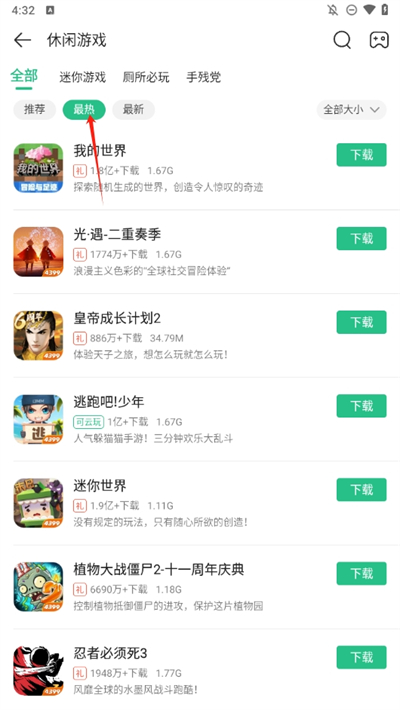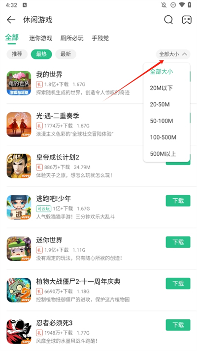 4、点击右侧的全部大小选项可以根据游戏的大小进行筛选,喜欢小游戏的玩家可以直接选择20MB以下的资源。