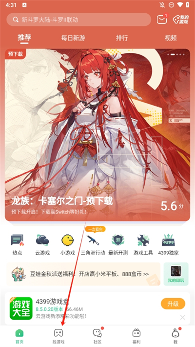 1、首先打开下载好的软件,进入之后再首页的位置可以看到许多推荐的游戏,点击下方的找游戏;