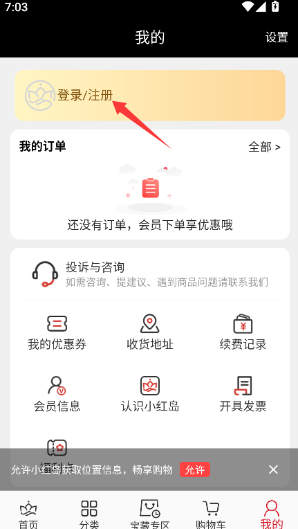 2、找到并点击“登录/注册”按钮,系统将自动跳转至账户登录与注册的主界面。