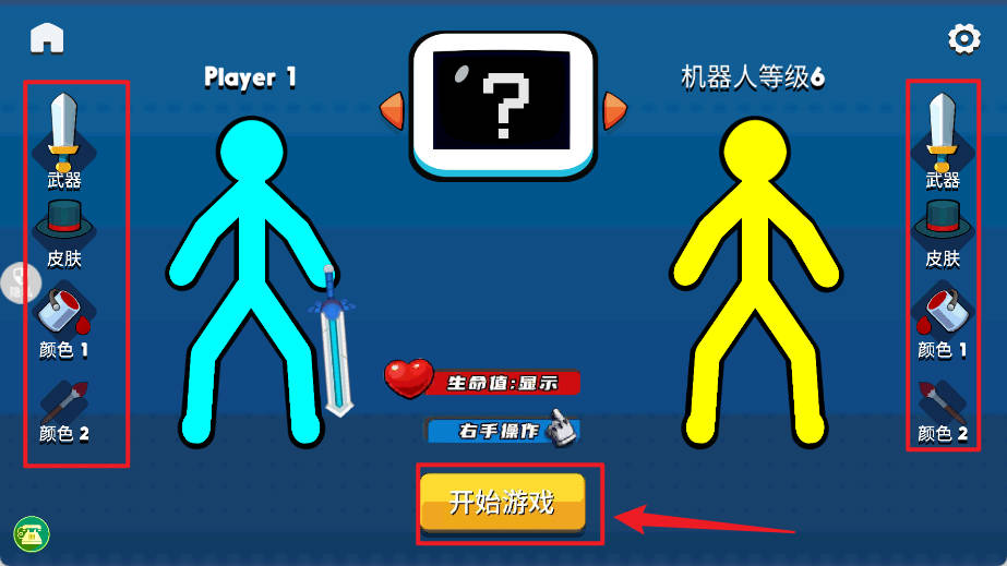 2、点旁键装配火柴人,装好点“开始游戏”战斗。