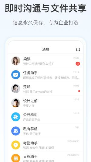 4、内置即时通讯工具,支持一对一聊天、群聊和讨论组,方便团队成员随时交流。