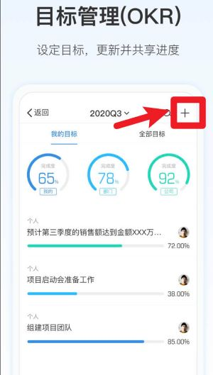 1、在目标管理界面点击右上角加号,即可新增季度目标,填写后系统会自动记录并显示完成进度。