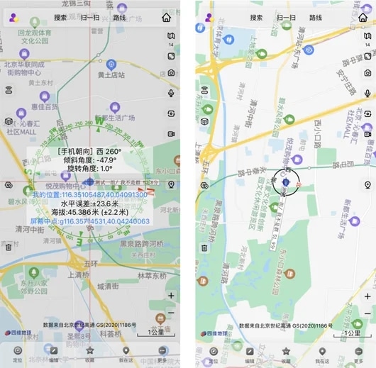 再次点击,则显示当前位置的各项数据,三击则显示指南针标识。