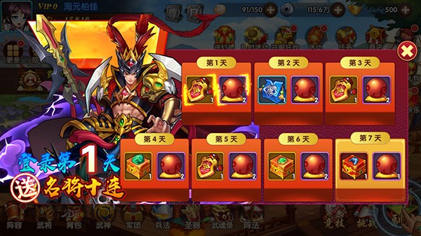 5、新手七日登录礼包,登录七天就送神级武将礼包,还有大量招募令免费领取。