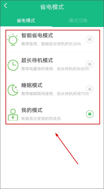 2、在【模式】页面,点击【省电模式】;即为手动设置:用户可根据自己手机电量情况,设置适合当前情况的省电模式
