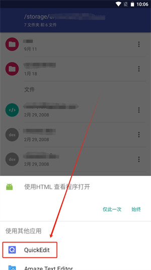 1、在手机的本地文件中,找到需要打开的文本,在弹出的打开方式中选择【quickedit】打开;