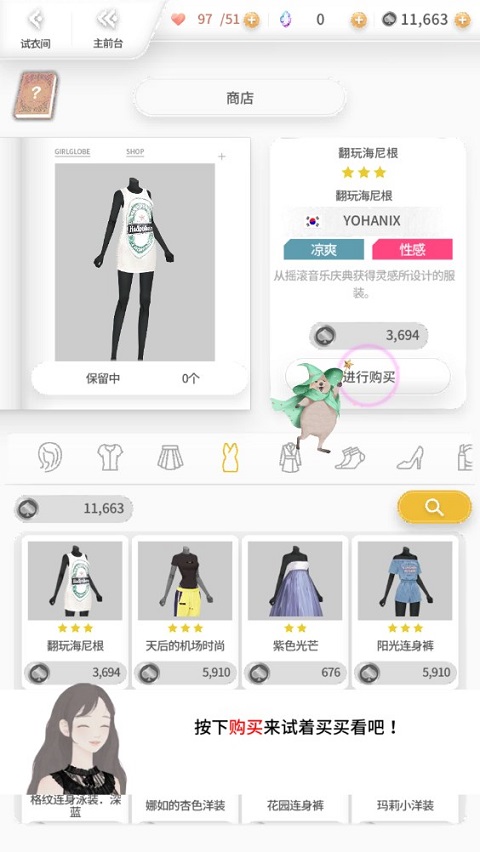 6、游戏内玩家可通过游戏商店,购买不同类型的服饰,并跟随剧情提供的场景进行服装搭配,具体可参考图中所示: