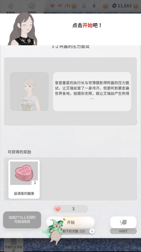 5、以剧情划分的章节关卡,每一关都有不同的挑战任务,点击“开始”,在领略剧情的同时,感受换装的魅力!
