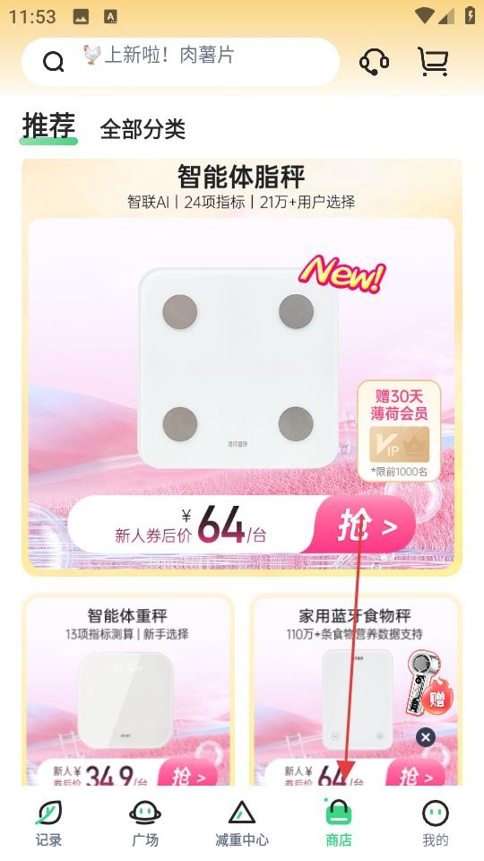 3、进入商店页面,查看智能体脂秤等健康产品,了解新人优惠和功能介绍,按需选择抢购,提升健康管理工具。