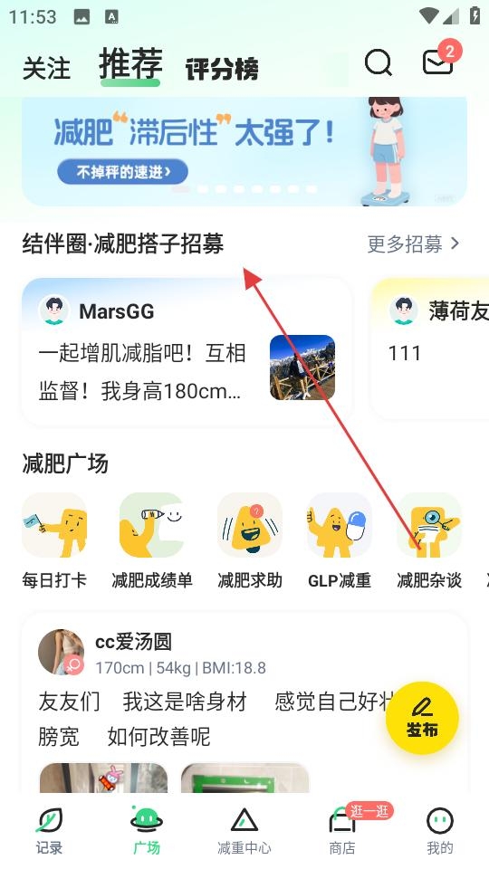 2、切换至广场页面,浏览推荐内容,关注减肥搭子招募,查看他人分享的减肥经验、身材讨论,参与互动交流。
