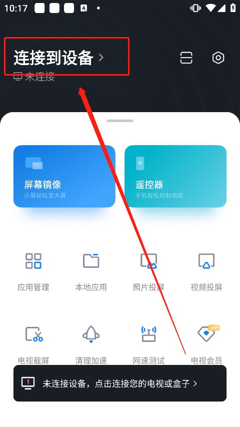 1、初次进入app,在投屏之前我们需要先新建电视与手机设备的连接,在下图所示位置点击“连接到设备”添加自己的电视设备