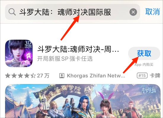 3、在搜索栏输入“斗罗大陆:魂师对决国际服”,点击获取,等待下载即可。