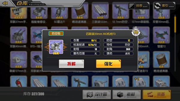 设备则好比是功能插件,主要有舰艇维修设备(仅限维修舰)、对空雷达、火控雷达、防鱼雷隔舱、液压弹射装置、SG雷达、电动扬弹机、液压舵机、改良锅炉、海军迷彩、燃油滤清器、航空副油箱、链式装弹机、陀螺仪、维修工具、灭火器,不同的设备发挥着不同的作用。