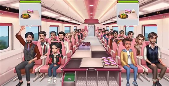 4、点击右侧的箭头可以前往车厢为顾客提供美食,顾客需要的美食会在头顶的气泡上显示。