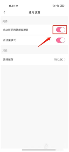 3、进入通用设置,点击【允许移动网络缓存漫画】右侧按钮开启。
