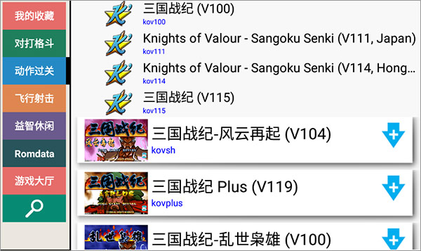 1、下载安装kawaks街机模拟器安卓版,运行后如下图所示,包含了对打格斗、动作过关、飞行射击、益智休闲等;